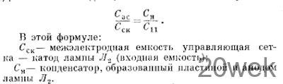 Лампа бП1ЗС имеет большую межэлектродную емкость анод—управляющая сетка (Сас), иначе называемую проходной емкостью лампы. Эта емкость может служить причиной самовозбуждения передатчика в рабочем диапазоне частот. Чтобы исключить возможность самовозбуждения, необходимо нейтрализовать вредное действие емкости Сас. Для этого ВЧ напряжение с анода лампы Л2, через конденсатор небольшой емкости, одной обкладкой которого служит пластина, расположенная рядом с баллоном 6П13С (на схеме пластина показана пунктиром), а второй — анод 6П13С, подается в анодную цепь лампы Л1— точку присоединения конденсатора С11. Этим компенсируют напряжение, проникающее через емкость Сас с анода лампы Л2 на ее управляющую сетку и создающее условия для самовозбуждения. Полная компенсация наступает, когда амплитуды обоих напряжений равны. Для этого необходимо, чтобы было выполнено условие: