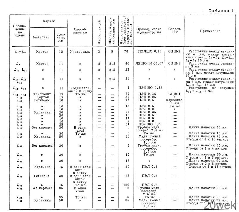 Данные катушек передатчика приведены в табл. 1. Накальный трансформатор Tp1 лампы выходного каскада ГУ-13 (Л11) имеет сердечник сечением 6,6 см2. Сетевая обмотка этого трансформатора содержит 1600 витков провода ПЭВ 0,3 мм, а накальная — 85 витков провода ПЭВ 1,4 мм.