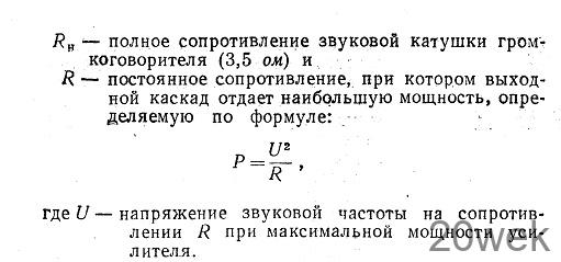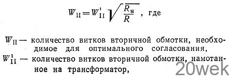 Если максимальная мощность получается при сопротивлении, равном полному сопротивлению громкоговорителя, то согласование правильное. Если же максимальная мощность получилась при другом значении сопротивления, то количество витков вторичной обмотки выходного трансформатора следует изменить. Оптимальное количество витков в этом случае может быть подсчитано по формуле: