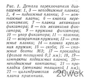 показаны штриховкой пунктиром). Переключатель в собранном виде показан на рис. 1. На чертеже помещены только основные детали, установленные на переключателе (подстроечные конденсаторы и каркасы катушек). Отдельные детали переключателя изображены на рис. 2 и 3. Кнопки переключателя изготовлены из органического стекла молочного цвета. Крепление их к планкам может быть осуществлено болтами. На чертежах крепление не показано. Регулировка собранного переключателя несложна и сводится лишь к обеспечению свободного перемещения каждой подвижной планки при нажатии кнопок и плавного возвращения их в исходное положение под действием возвратных пружин. Это достигается подбором толщины прокладок между стяжными дюралевыми и неподвижными гетинаксовыми планками переключателя, а также подбором возвратных пружин с тем, чтобы они с одной стороны преодолевали удерживающие силы неподвижных пружинных контактов при выключении фиксирующего механизма и, с другой стороны, обеспечивали плавное возвращение планок в исходное положение. Кроме того, для обеспечения четкой работы фиксирующего механизма необходимо обратить внимание на точность изготовления упоров 10, чтобы фиксирующая планка 7 при нажатии кнопок каждого из диапазонов отходила на одинаковую величину.