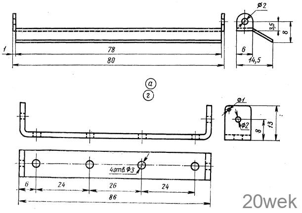 Переключатель собирается из трех подвижных и четырех неподвижных гетинаксовых планок толщиной 2 мм. Форма и размеры планок указаны на рис. 2.