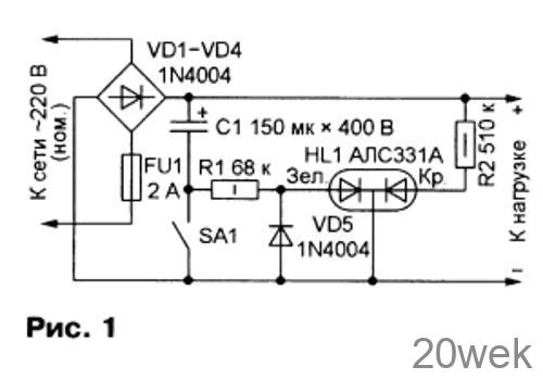 Обратите внимание на диод VD5 Без него при отключении регулятора от сети с подключенной нагрузкой (что случается довольно часто) напряжение заряженного конденсатора С1 оказалось бы приложенным к светодиоду в обратной полярности. Это неизбежно привело бы к пробою зеленого кристалла. Диод VD5 защищает светодиод от пробоя и обеспечивает безопасную разрядку конденсатора С1 через резистор R1.