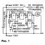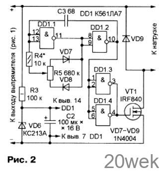 Схема ШИ регулятора, дополняющего рассмотренный выше выпрямитель, изображена на рис. 2. Его прототипом послужило устройство, описанное в статье И. Нечаева «Малогабаритный регулятор мощности» («Радио», 2003, № 7, с. 38). Отличия — способ питания микросхемы DD1 и более мощный полевой транзистор VT1. Изменяя переменным резистором R5 скважность открывающих транзистор импульсов от 1,01 до 100, удается уменьшать выпрямленное напряжение, поступающее на нагрузку почти до нуля. Это обеспечивает работу паяльника как с уменьшенной мощностью, так и с перегревом, который может потребоваться для пайки массивных деталей. Очень удобно установить в качестве R5 переменный резистор, спаренный с выключателем SA1 (см. рис. 1). Последний должен срабатывать в положении движка переменного резистора, соответствующем минимальному выходному напряжению.