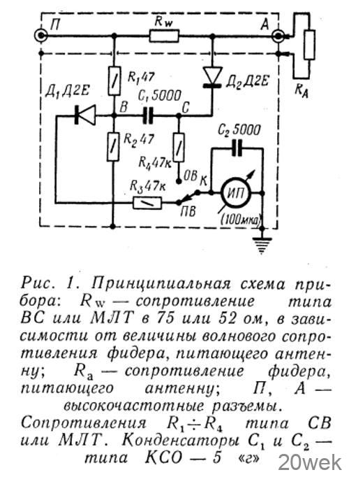 Прибор предназначается для измерения КСВ (коэффициента стоячей волны) в антенно-фидерных системах, любительских КВ радиостанциях и может быть использован для согласования антенны с фидером при настройке системы. Описываемый прибор с точностью не хуже 10-15% может измерять КСВ на всех любительских диапазонах и рассчитан на подключение к фидеру (около передатчика) с волновым сопротивлением Rw =50—75 ом.
