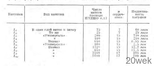Обмотки контурных катушек и катушек обратной связи намотаны на бакелизированных бумажных гильзах диаметром 12 и длиной до 40 мм, надетых на ферритовые сердечники. Намотка типа «Универсаль» и внавал между изоляционными шайбами. При регулировке пределов измерения индуктивности приходится изменять число витков. Данные катушек помещены в таблице. Визир — указатель для шкалы индуктивностей изготовлен из органического стекла толщиной 2 мм. С помощью болтов он прикреплен к оси конденсатора С6. Ось этого конденсатора соединена с ручкой настройки через замедляющий верньер.