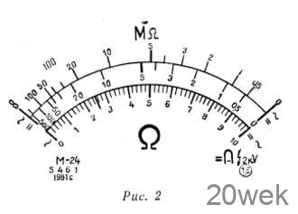 Индикатором служит микроамперметр М-24 чувствительностью 50 мка. Шкала омметра (нижняя) равномерная и линейная, шкала мегометра (верхняя) неравномерная (рис. 2).