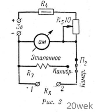 При измерении малых сопротивлений измеряемое сопротивление Rx подключено параллельно стрелочному индикатору и источнику питания с низким напряжением (рис. 3). Ток в измерительной цепи не выше 12 ма.