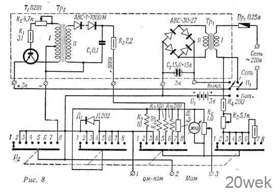 На рис. 8 приведена схема описанного прибора с расширенным диапазоном измерений. Такой прибор будет измерять сопротивления от 0 до 500 Мом.