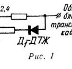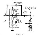 Детали приставки размещены в корпусе размерами 75x75x50 мм Восьмиштырьковая ламповая панель для подключения к кинескопам 35ЛК2Б или 43ЛК2Б укреплена на конце кабеля. Монтировать эту панель в корпусе прибора нельзя, так как приставка, надетая на цоколь кинескопа, может повредить его. Для того чтобы можно было присоединять к приставке другие типы кинескопов нужно изготовить переходные панели. Переключатели П1 П2 и П3 могут быть любой конструкции, в частности для П2 и П3 можно использовать двухполюсные тумблеры на два направления. При нажиме кнопки цепь накала кинескопа должна разрываться. Конденсаторы С1 и С2 должны быть на рабочее напряжение 600 в, а диоды Д1 —Д4—— иметь обратное сопротивление не менее 100 ком. В качестве Tp1 использован унифицированный выходной трансформатор кадровой развертки (ТВК), с вторичной обмотки которого отмотано 47 витков. Сопротивления R1 R2 и R3 подбираются так, чтобы получить напряжения, указанные на принципиальной схеме. Напряжение между лепестками 1 и 7 панели для включения кинескопа (катод — подогреватель) должно быть 125 в, в противном случае необходимо подобрать сопротивления R4 и R5.