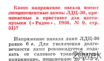 При напряжении сети 127 в применяются люминесцентные лампы, рассчитанные на 127 в. В статье не указывается, какие выбираются цвета и каким частотам звукового диапазона они соответствуют, так как понятие низких, средних и высоких частот существенно зависит от звуковой программы. Большинство зрителей высказывается за общепринятое соответствие: низкие частоты — красный цвет, средние — зеленый или желтый, а высокие — синий.