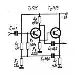 Самодельными деталями конструкции являются сопротивление R1 и импульсный трансформатор Тр1. Сопротивление R1 наматывается на керамическом каркасе от сопротивления типа ВС-2 и содержит 20— 25 витков провода от спирали для электроплитки. Отвод делается примерно от середины. Более точно место отвода определяется по энергии вспышки, которая сравнивается с энергией заводской вспышки или со вспышкой при напряжении сети 220 в. Импульсный трансформатор наматывается на катушке из эбонита, органического стекла или текстолита диаметром 7 мм и длиной 20 мм. Его первичная обмотка наматывается поверх вторичной. Обмотка I содержит 30 витков провода ПЭЛ 0,69, обмотка II—2000 витков провода ПЭЛШО 0,06. В качестве реле Р1 можно применить реле любого типа с током срабатывания не более 10—15 ма.