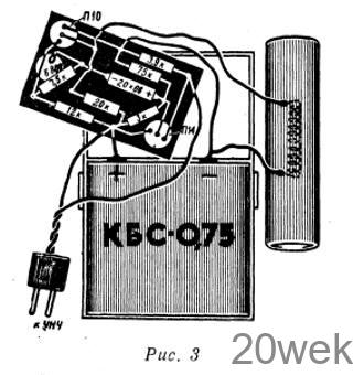 Во входном каскаде применен малошумящий транзистор П10. Усилитель потребляет от батареи карманного фонаря ток 1 ма. Смонтирован он на гетинаксовой плате размером 60 X 40 мм (рис. 3). Усилитель вместе с батареей питания укреплен с нижней стороны грифа инструмента.