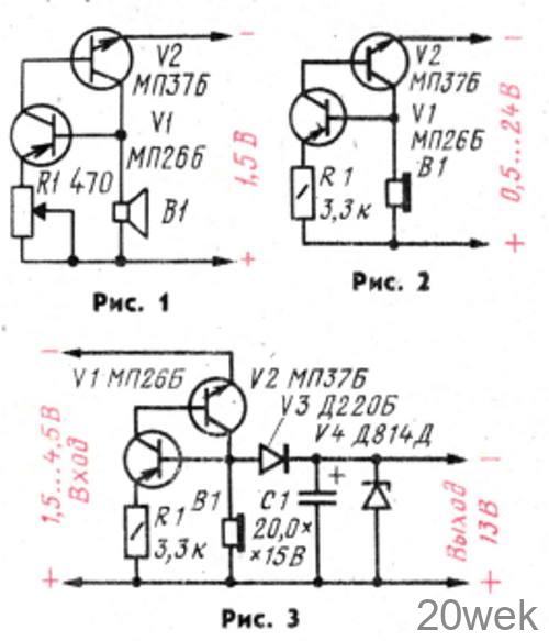 Несколько изменив схему и включив в генератор динамическую головку и переменный резистор (рис. 2), удастся значительно повысить громкость звука — он кстати, напоминает автомобильный сигнал, Переменным резистором подбирают режим устойчивой генерации при наибольшем изменении питающего напряжения. Такой генератор удобно использовать в качестве квартирного звонка.