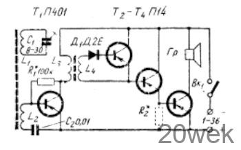 Приемник предназначен для громкоговорящего приема радиовещательных станций в диапазоне средних волн (187—550 м). Его первый каскад на транзисторе Т1 типа П401 является усилителем ВЧ. Катушки L1 и L2 антенного контура намотаны на ферритовом стержне Ф-600 диаметром 8 мм и длиной 70 мм и содержат: L1—130 витков провода ПЭЛ-0,1-0,3, намотанных виток к витку; L2—5-8 витков такого же провода, размещенных на подвижной бумажной манжете. Катушки L3 и L4 намотаны на ферритовом кольце Ф-1000 диаметром 10 мм и содержат соответственно 80 и 160 витков провода ПЭЛ-0,1-0,15.