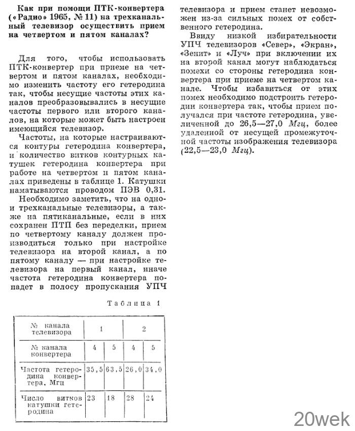 Унифицированный переключатель телевизионных каналов (ПТК) состоит из усилителя ВЧ и преобразователя, в котором сигналы любого из двенадцати телевизионных каналов преобразуются в стандартную промежуточную частоту телевизионных приемников. Полоса промежуточных частот, образующаяся на выходе ПТК, простирается от 27,75 до 34,25 Мгц. Превратить ПТК в конвертер для подключения ко входу телевизора, рассчитанного на прием первого, второго и третьего телевизионных каналов, можно, переделав его таким образом, чтобы после преобразования на выходе ПТК-конвер- тера получались частоты какого-либо из перечисленных выше каналов. Это можно сделать, изменив частоты, генерируемые гетеродином ПТК, для чего необходимо перемотать контурные катушки гетеродина 6—12 каналов (L1_36, L1_39, L1_42, L1_45, L1_48, L1_51, L1_54, L1_57, L1_60) И изменить схему анодной цепи пентодной части лампы 6Ф1П Л1_2).