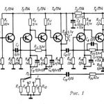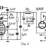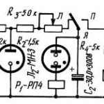 В гетеродинном каскаде с емкостной обратной связью используют один триод лампы 6Н1П (Л2). Контурные катушки гетеродина (L5L6) при налаживании переключателя настраиваются карбонильными сердечниками. Подстройка гетеродина во время приема телепередач производится конденсатором переменной емкости С9. Цепь управляющей сетки лампы Л1 усилителя ВЧ выведена на ножку 4 соединительной колодки так, как это сделано в унифицированном ПТК. Это дает возможность регулировать контрастность путем подачи изменяющегося отрицательного напряжения смещения на лампу Л1 Остальные цепи питания переключателя также присоединены к тем же ножкам соединительной колодки, как в унифицированном ПТК. Благодаря этому переключатель можно присоединить к любому телевизору.