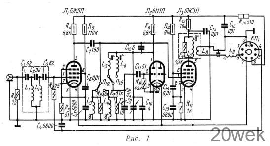 Усилитель ВЧ собран на лампе 6Ж5П (Л1) по схеме с параллельным питанием. Его анодной нагрузкой является контур, состоящий из катушки L3 или L4, внутриламповых и монтажных емкостей. Настройка этого контура на нужную частоту осуществляется изменением индуктивности катушки при помощи латунного сердечника. Напряжение с усилителя ВЧ через разделительный конденсатор С7 поступает на сетку преобразовательной лампы 6ЖЗП (Лз), в анодную цепь которой включен фильтр промежуточной частоты. Первичная обмотка фильтра (L7) настроена на частоту 27,75 Мгц. Эта обмотка, а также катушка связи L8 намотаны на каркасе, укрепленном на шасси переключателя. Вторичная обмотка фильтра (L9) вынесена в колодку, посредством которой переключатель соединяется с телевизором и настроена на частоту 34,25 Мгц.