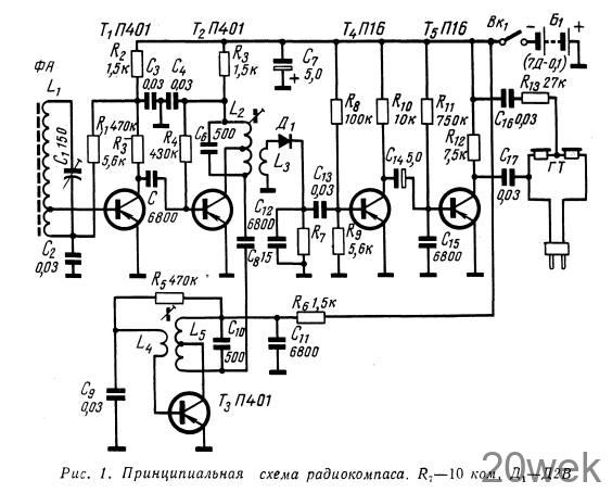 Предлагаемый радиокомпас позволяет на бегу определять направление с большой точностью, не отвлекает внимания охотника. Радиокомпас представляет собой малогабаритный радиоприемник, собранный на транзисторах, с ферритовой антенной. Он настраивается на радиовещательную станцию, работающую в длинноволновом или средневолновом диапазонах. Принципиальная схема приемника приведена на рис. 1. Он имеет два каскада усиления ВЧ, гетеродин для получения звуковых биений с несущей принимаемой радиостанции, диодный детектор и два каскада усиления НЧ. Подстройка контуров L1C1; L2C6, L5С10 осуществляется до старта с помощью отвертки. Выход усилителя низкой частоты подключен к одному из головных телефонов через цепочку из C16 С17 R13. Конденсаторы С16 и С17 отделяют от деталей радиокомпаса постоянную составляющую анодного напряжения оконечной лампы приемника для «охоты на лис», в анодную цепь которой включены телефоны. Сопротивление R13 предохраняет выходной транзистор радиокомпаса от пробоя выходным напряжением приемника.