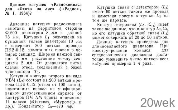 Описанная конструкция применялась автором на соревнованиях и тренировках сезона 1963 г. Несмотря на относительную громоздкость и кажущееся неудобство крепления радиокомпаса на голове, были доказаны преимущества радиокомпаса и несравненно большие удобства по сравнению с магнитным. Радиокомпас рекомендуется изготовлять и применять охотникам, хорошо освоившим технику пеленгации, особенно ближний поиск. В заключение следует указать, что данные ферритовой антенны и катушек L2~L5 зависят от диапазона, в котором работает радиовещательная станция.