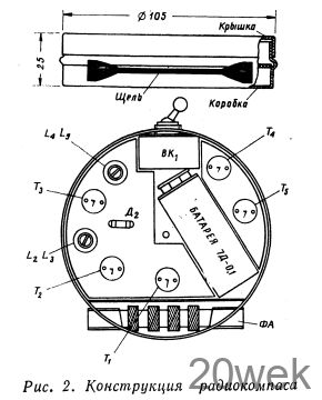Радиокомпас собран в жестяной коробке диаметром 105 мм и высотой 25 мм с крышкой (рис. 2). Он укрепляется на голове охотника и может поворачиваться вокруг вертикальной оси. Ферритовая антенна экранирована от последующих каскадов. Как и вообще для всякой аппаратуры охотника, важнейшим требованием является высокая надежность.