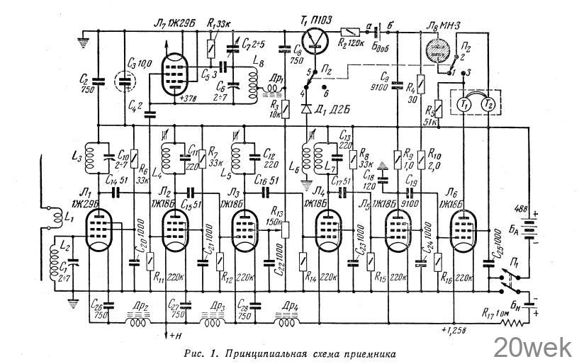 Приемник выполнен на семи стержневых лампах (см. рис. 1). Усилитель ВЧ собран на лампе 1Ж29Б (Л1). С антенны сигнал через катушку L1 поступает на входной контур L2C1, настроенный на частоту 145.5 Мгц. Анодный контур L3С10 каскада ВЧ настроен на частоту 144.5 Мгц.