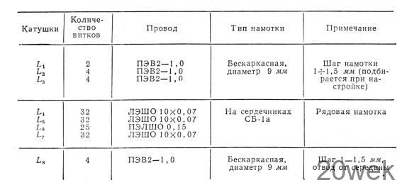 Дроссели Др1 Др2, Дрз и Др4 намотаны проводом ПЭЛ 0,6 и размещаются на ферритовых сердечниках СЦР диаметром 6 мм и длиной 10 мм. Каждый дроссель состоит из восьми витков. Конденсаторы C1C6 — КПК 2/7. Конденсатор С7— типа КПВ-50, в котором оставлено две подвижные и одна неподвижная пластины. Остальные конденсаторы типа КСО, КТ-1, КДС и БМ-1.