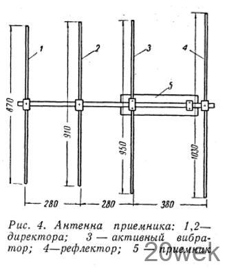 Антенна четырехэлементная типа «волновой канал», крепится к верхней крышке приемника. Активный вибратор разрезной. Все элементы антенны выполнены из дюралевой трубки диаметром 12 мм. Изоляторы антенны изготовлены из органического стекла толщиной 25 мм. При отсутствии органического стекла можно применить текстолит или гетинакс. Размеры антенны показаны на рис. 4.