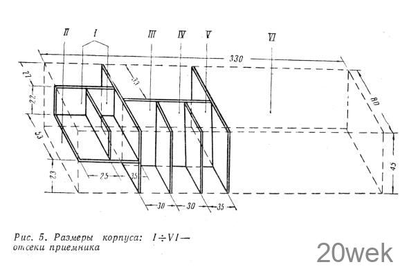 Конструкция и детали. Корпус приемника и внутренние экраны изготовлены из алюминия толщиной 1мм. Размеры корпуса и экранов показаны на рис. 5.