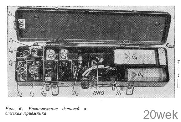 Питание. Питается приемник от батарей слуховых аппаратов. Анодная батарея Ба типа 49 САМЦГ— 0,25—П; батарея накала Бн — 1.58—СНМЦ—2,5—П.