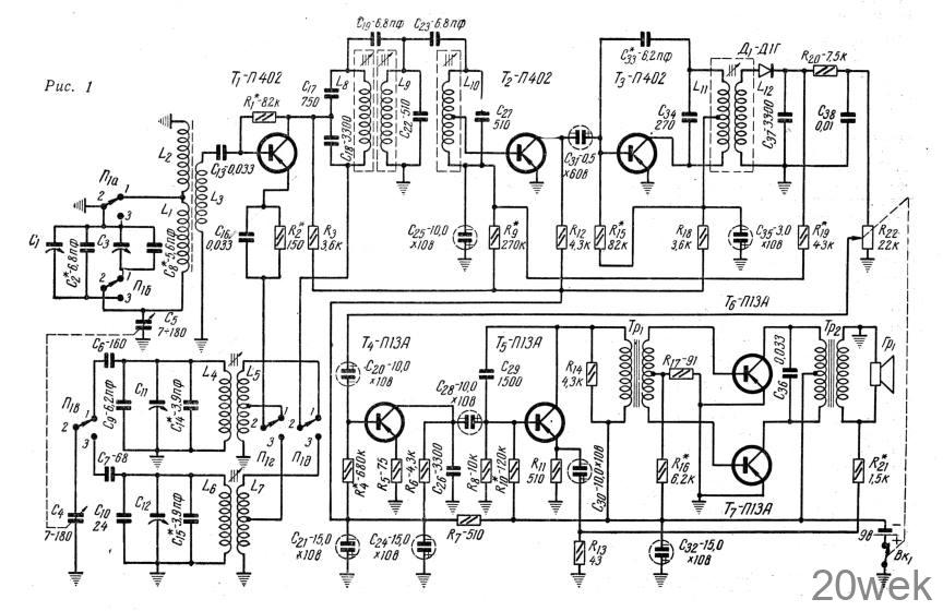 Схема радиоприемника. Преобразователь частоты построен на транзисторе П-402 (Т1). Нагрузкой коллекторной цепи Т1 служит трехконтурный фильтр сосредоточенной селекции. Стабилизация режима транзистора Т1 и подача смещения на него производится при помощи сопротивлений R1 и R3- Первый (апериодический) каскад УПЧ собран на транзисторе П402 (Т2). Рабочая точка этого транзистора не стабилизируется так как на него подается АРУ. Второй каскад УПЧ на транзисторе П402 (Тз) нагружен на контур L11 С34, который для повышения стабильности каскада имеет широкую полосу пропускания, порядка 30— 40 кгц. Нейтрализация каскада создается конденсатором Сзз, а стабилизация рабочей точки транзистора и автоматическое смещение — сопротивлениями R 15 R 18- Детектором служит диод Д1Г (Д1). Постоянная составляющая выпрямленного напряжения используется для АРУ.