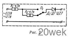 Питание приемника осуществляется от батареи типа «Крона» или аккумуляторной батареи типа 7ДО,1, При питании от аккумулятора к приемнику прилагается специальное зарядное устройство, схема которого показана на рис. 2. Зарядка аккумулятора осуществляется от сети переменного тока 127 или 220 В. Ток зарядки 12 ма, время зарядки 15 час.