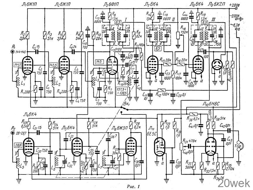 Принципиальная схема приемника приведена на рис. 1. В диапазоне 144—146 Мгц усилитель ВЧ выполнен на двух лампах Л1 и Л2. Смеситель собран на левой половине лампы Лз, гетеродин — на правой.
