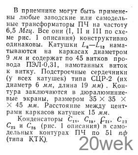 Контуры промежуточной частоты можно использовать любые двухконтурные, настроенные на частоту 6,5 Мгц; данные контурных катушек приведены в таблице.