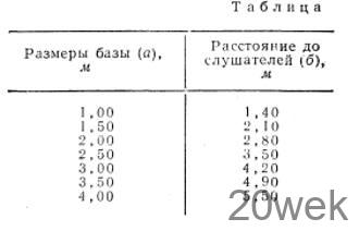 Если выбрать (рис. 1) неодинаковые расстояния между агрегатами (а), а также агрегатами и слушателем (б) так, чтобы «угол прослушивания» составил примерно 52°, то в сильно заглушенной комнате можно получить лучшие результаты. Дальнейшие исследования показали, что в условиях жилой комнаты «угол прослушивания» должен быть еще меньше — порядка 40°. При таком расположении акустических агрегатов во время проигрывания испытательной грампластинки звук кажется исходящим из точки, находящейся точно посередине между акустическими агрегатами. Так как непосредственное измерение угла прослушивания затруднительно, рекомендуется пользоваться приводимой таблицей наиболее часто встречающихся расстояний с точностью до 10 см, при соблюдении которых получается необходимый угол. Например, если в комнате средних размеров база между акустическими агрегатами выбрана в 3 м, то тогда слушатели должны располагаться на расстоянии не менее 4,1 м от базовой линии. На рис. 1 показана пунктиром область стереоэффекта, а также дан один из возможных вариантов расположения слушателей.