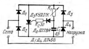 Тиристор Д5, включенный в диагональ моста, составленного из диодов Д1—Д4. играет роль управляемого ключа, который открывается при разряде конденсатора С, через ограничительный резистор R1 и управляющий переход тиристора при включении переключающего диода Д6. Напряжение, при котором тиристор включается, можно регулировать потенциометром R1. Вместо переключающего диода Д6, можно использовать стабилитрон, но в этом случае уменьшается диапазон регулировки напряжения на нагрузке.