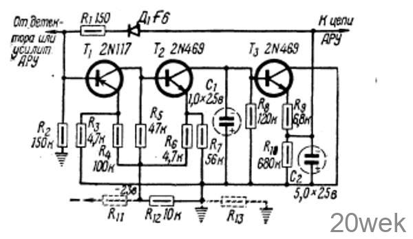 Для некоторых приемников требуется небольшое смещение в цепи АРУ даже при отсутствии сигнала, тогда в схему АРУ нужно добавить сопротивление R13. Величину сопротивления R1з можно определить по формуле: