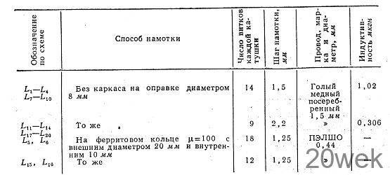 ПРИМЕЧАНИЕ: Катушки L1-L4, L7-L10, L11-L14L17-L20 наматываются без перерыва провода. Разделение достигается путем отпаек в соответствующих местах.