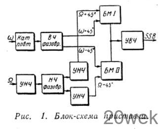 В приставке использован двух-фазный способ получения однополосного сигнала. При этом способе несущая подавляется с помощью балансных модуляторов. Блок-схема приставки представлена на рис. 1.