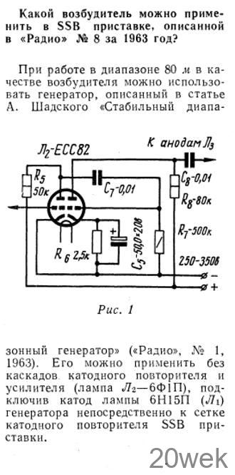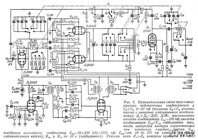 Напряжение ВЧ поступает с возбудителя через катодный повторитель на высокочастотный фазовращатель, состоящий из сопротивлений и R2 и на одном из диапазонов из конденсатора С3 и индуктивности (см. рис. 2 — принципиальную схему приставки). На схеме рис. 2 нет катушек диапазона 3,5 Мгц.