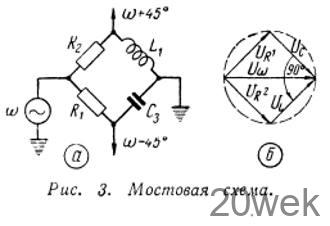 Высокочастотный фазовращатель собран по мостовой схеме, образованной R1 R2 С3 L1 (см. рис. 3,а). На рис, 3,б представлена векторная диаграмма, поясняющая работу фазовращателя. Из диаграммы видно, что сдвиг фазы в 90° получается при условии, что R=Xc=Xe. Обычно R1 и R2 берутся в пределах 50-100 ом. Соответственно рассчитываются величины L и С. Напряжение на вход фазовращателя необходимо подавать с катодного повторителя, так как входное сопротивление фазовращателя низкое (приблизительно равно величине активных сопротивлений). С выхода фазовращателя напряжения подаются на сетки балансных модуляторов через разделительные конденсаторы С7, С8 и С9, С10 (см. рис. 2).