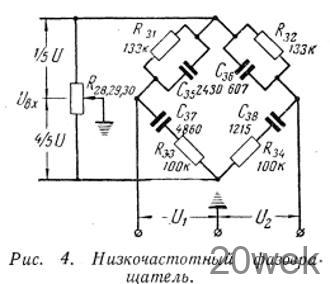 Напряжение НЧ с микрофона МД- 41 подается на вход двухкаскадного усилителя НЧ на лампе Л5. Элементы схемы рассчитаны так, чтобы максимальное усиление было в полосе частот от 300 до 3000 гц. В анодную цепь второго каскада через согласующий трансформатор Тр1 включен низкочастотный фазовращатель из R31, R32, R33, R34, C35, С36, С37, С38 (см. рис. 4). Этот фазовращатель также собран по мостовой схеме из последовательно и параллельно включенных RC цепей.