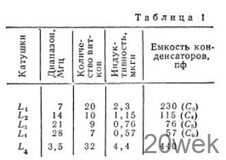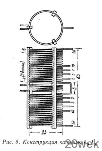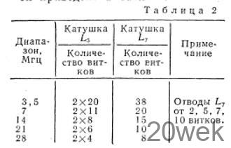 Катушки L5, L6 и L7 наматываются на керамических каркасах диаметром 25 мм (или без каркаса). Катушка L6 помещается между половинами катушки L5. Количество витков катушек приведено в табл. 2