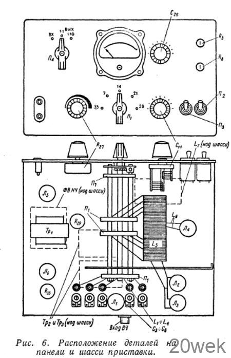В приставке используется прибор ма, который позволяет контролировать напряжение на входе и выходе приставки и, соответственно, балансировать модуляторы по максимальному подавлению несущей. Для лучшей балансировки схемы катоды ламп Л2 и Л3 можно соединить с шасси через конденсаторы по 1000 пф.