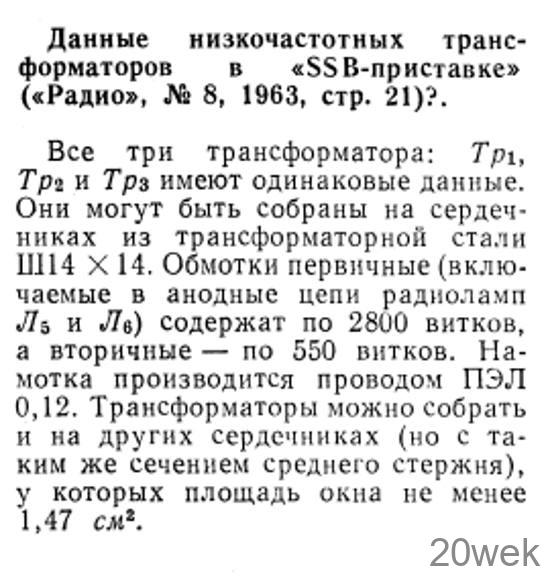Величины R и С рассчитаны так, чтобы фазовый сдвиг выходных напряжений был равен 90° в диапазоне частот от 300 до 3000 гц. От точности номиналов элементов фазовращателя в большой степени зависит фазовый сдвиг выходных напряжений. Обычно в подобных фазовращателях отклонение от номиналов деталей допускается не более 1%, но, как показала практика, для любительских целей можно собирать фазовращатель из сопротивлений и конденсаторов с допуском до ±5%. С выходов фазовращателя напряжения подаются на каскады усиления (лампа Л6). Потенциометр R35 служит для выравнивания усиления каскадов. В анодах лампы Л6 включены трансформаторы Тр2 и Тр3 для получения двух противофазных напряжений, подаваемых на управляющие сетки ламп балансных модуляторов.