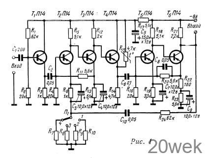 Высокостабильный усилитель (рис. 1) построен на транзисторах типа П14. Отличительной особенностью схемы является наличие глубокой отрицательной обратной связи как между отдельными каскадами, так во всем усилителе в целом.