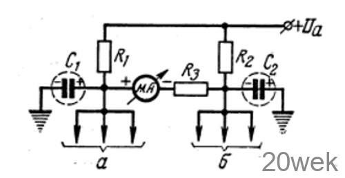 Однако непосредственный замер напряжения АРУ шунтирует последний контур усилителя ПЧ и требует прибора чувствительностью не хуже 50—100 мка. Индикатором настройки может быть и более «грубый» прибор (до 5 ма), включаемый в мостовую схему (см. рисунок). В одном плече этого моста а включены анодные цепи ламп, охваченных действием АРУ, в другом плече все остальные каскады радиоприемника, потребляющие ток от источника анодного питания.