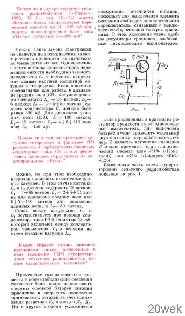 Согласно данным рис. 2, в случае замены диодов Д2 постоянным резистором на 1 ком, приемник сохранит свою работоспособность при разряде батареи с 9 до 7 в. Правда, приемник может работать и при меньшем напряжении питания, если только генерирует гетеродин, но чувствительность приемника будет крайне низка, а звук хриплым и искаженным. Именно так ведут себя большинство приемников, не имеющих временной стабилизации.