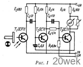 Тахометр, схема которого помещена на рис. 1, предназначен для измерения скорости вращения от 10 до 100 оборотов в секунду. Свет от лампы через отверстие в диске, который вращается и скорость которого хотят измерить, попадает на фототранзистор Т1. Импульсы света преобразуются в электрические, используемые для запуска электронного ключа с одним устойчивым состоянием, собранным на транзисторах Т2 и Т3 (П13, Г114). Средний ток коллектора транзистора Тз, измеренный миллиамперметром, пропорционален скорости вращения диска с отверстием. Следовательно, можно непосредственно отградуировать шкалу прибора в оборотах/секунду. Постоянная времени цепочки С1 и R1 должна быть меньше времени одного оборота диска с отверстием.