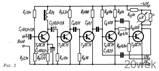 На рис. 2 изображена схема частотомера, позволяющего с большой точностью измерять частоту синусоидальных сигналов, в пределах от 20 гц до 200 гц, от источника с выходным сопротивлением порядка 600 ом. Синусоидальные сигналы, поданные на вход устройства, усиливаются, ограничиваются и после дифференцирования так же как и в предыдущем приборе запускают устройство с одним устойчивым состоянием.