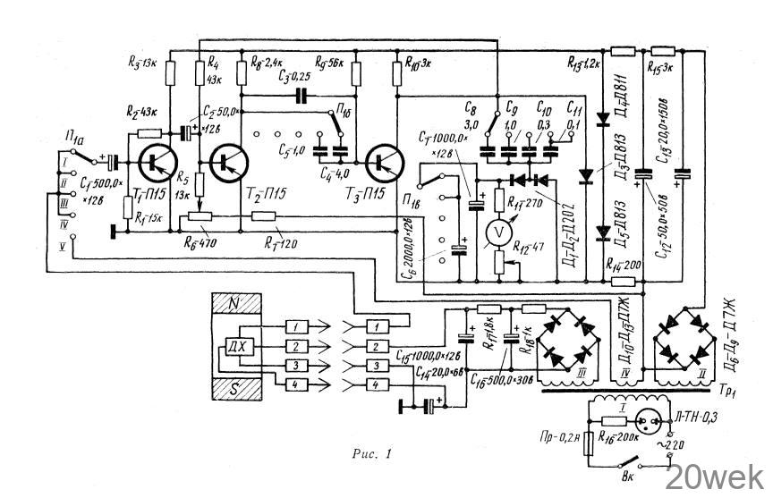 Тахометр предназначен для бесконтактного измерения скорости вращения в диапазоне скоростей от 30 до 6000 оборотов в минуту (от 0,5 до 100 гц) с точностью 1,5%. Соответственно требованиям была выбрана схема измерения. С целью получения возможности бесконтактного измерения скоростей вращения датчик Холла ДХ закрепляется неподвижно на вспомогательном штативе, расположенном в зазоре постоянного магнита. Магнит же прикрепляется к торцу вращающегося вала. Таким образом отпадает необходимость в применении скользящих контактов для соединения датчика с измерительным устройством. В качестве датчика Холла применена пластинка германия п- типа. Питание датчика осуществляется от выпрямителя на диодах Д10— Д13 (Д7Ж) с RC фильтром (R17, R18, С14— C16). Емкость С14 служит для уменьшения уровня пульсации выпрямленного напряжения. С датчика снимается переменная эдс Холла с частотой вращения вала, которая подается на вход транзисторного измерителя частоты. В основу схемы частотомера положена схема, предложенная инженерами Ивановым И. Н. и Сафоновым В. И. Частотомер позволяет получить точность измерения 1,5%.
